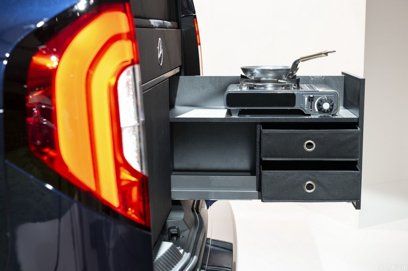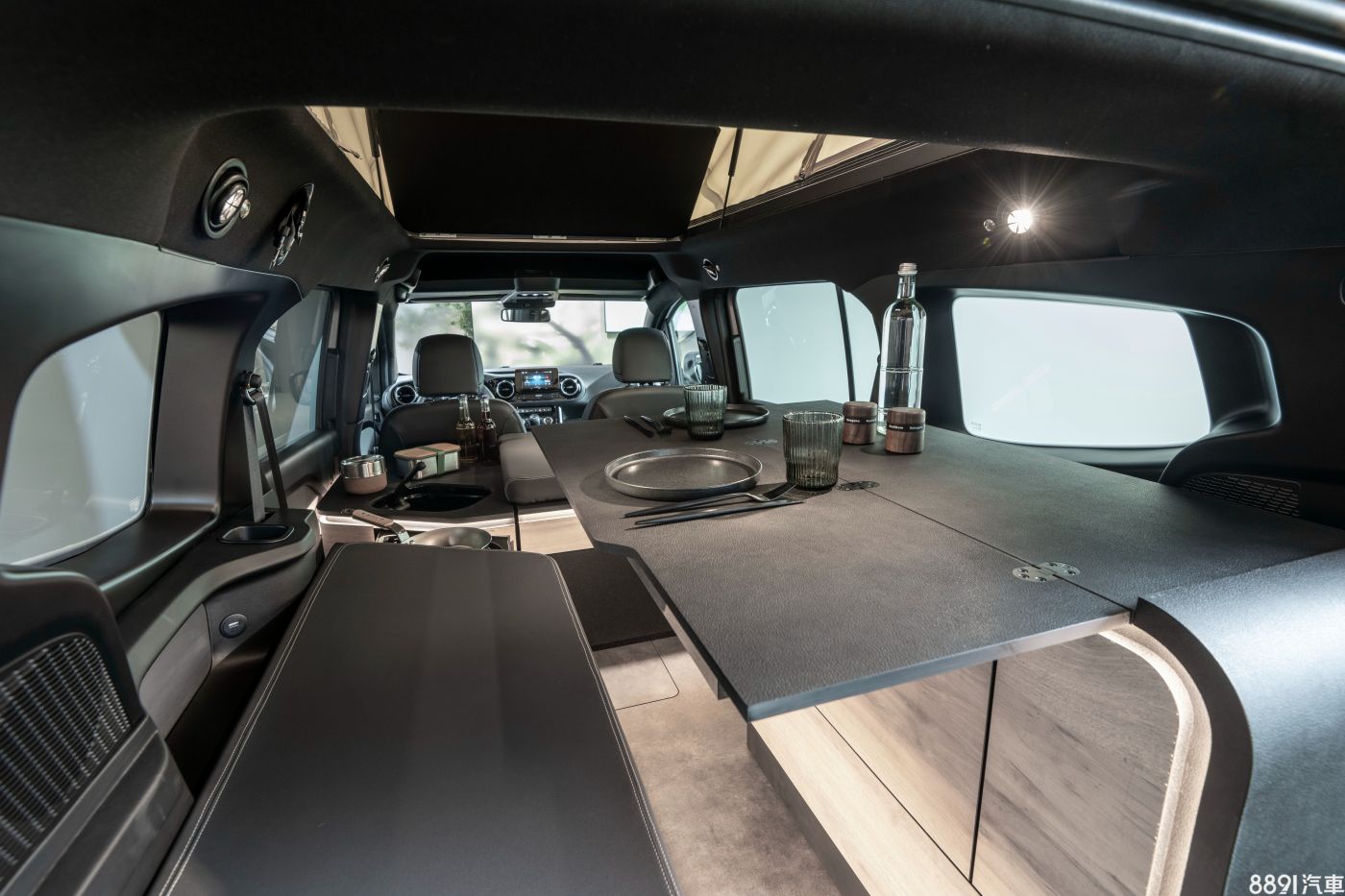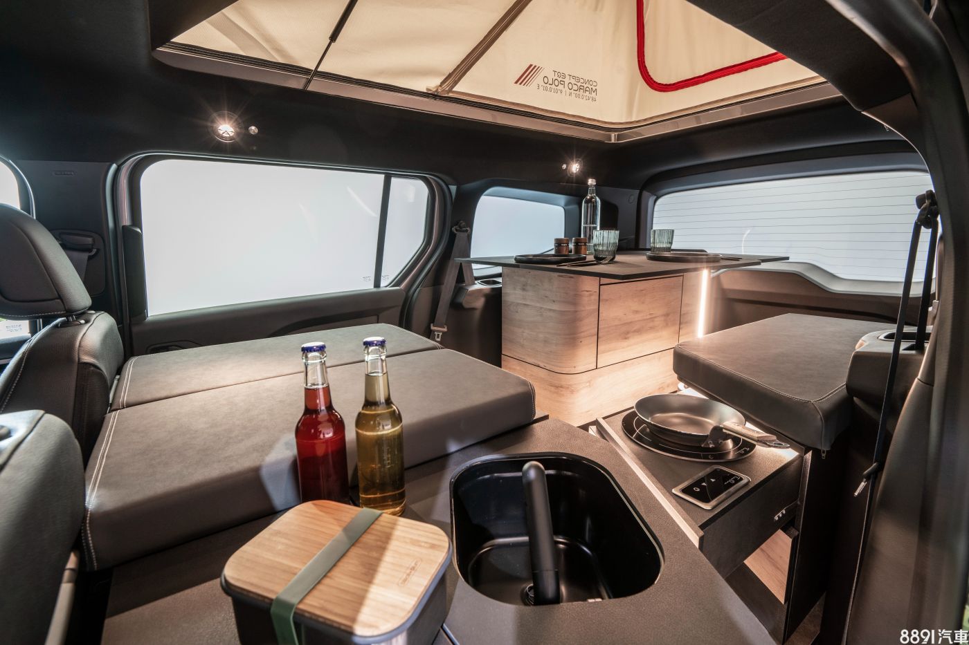 新車依舊走「豪華露營風」,除了具備車頂帳棚睡床,還可選折疊式床墊、冰箱、流理台、可收納爐灶、折疊式餐桌、儲物櫃等,座椅下方還配置有備用電池組,作為照明、充電之用。