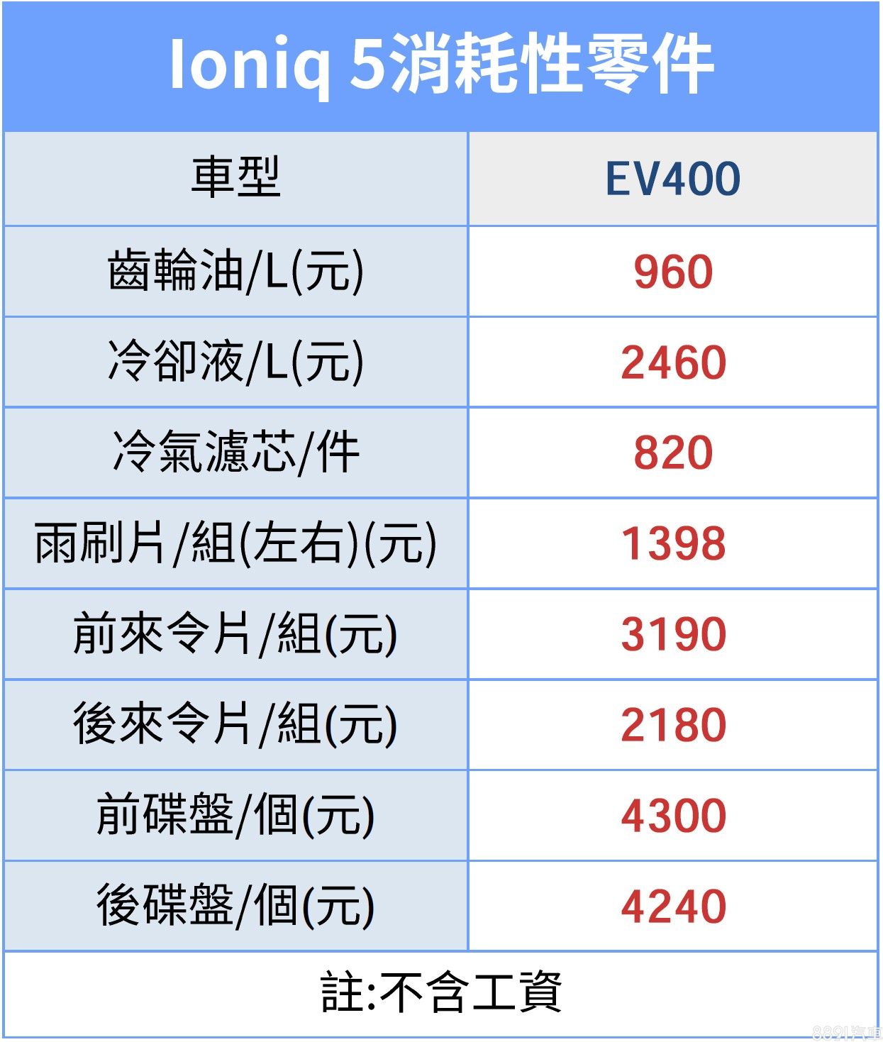 要是拿來和同樣平價品牌電動車的bZ4X相比,Ioniq 5的消耗性零件只有冷卻液明顯比較貴,其他項目價格都在合理範圍。