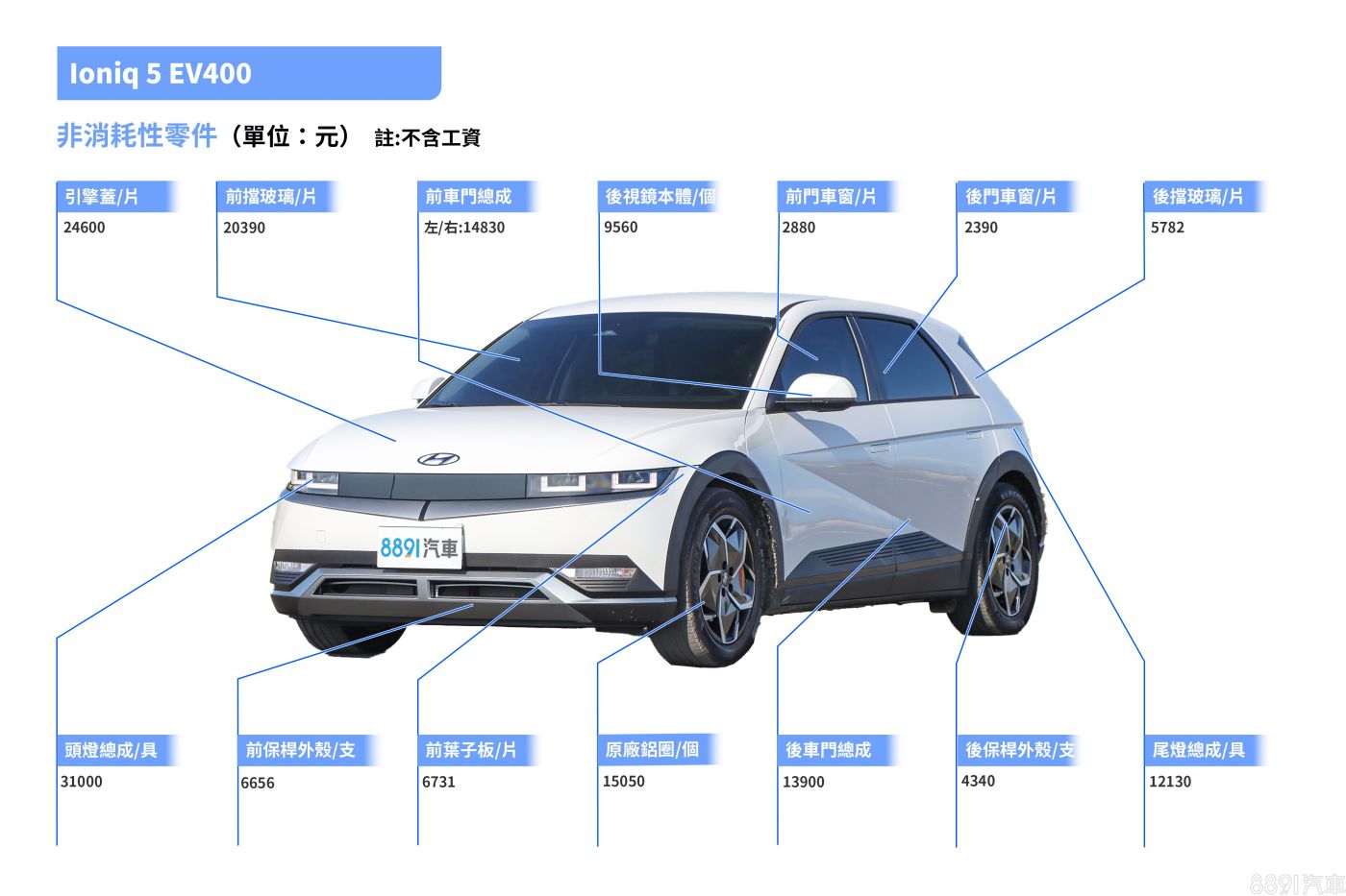 至於非消耗性零件,多數比bZ4X來得貴,只有車窗便宜一些,尤其是頭燈部分,就算是入門的EV400,單邊頭燈總成也要31000,如果是EV600的投射式頭燈,理論上價格還會更高一些。