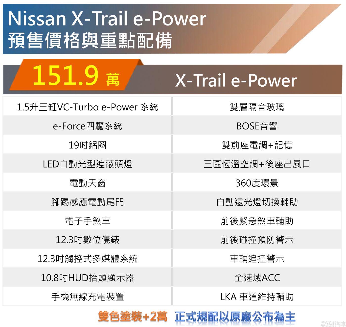 大改款X-Trail率先以進口身分的e-Power版與國內消費者見面,新車採單一車型設定,預售價151.9萬起,雙色車頂須加價2萬,若想要黑橘雙色內裝得再添2萬,重點配備可參考上表。據了解目前雖已接單破2千張,但首年首批配額僅600台,預計農曆年後才開始交車,至於國產1.5T汽油版最快第3~4季登台,預計供應前驅與四驅版,價格有望落在110~120萬左右。