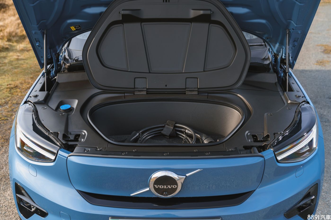 由於較為傾斜的車頂線條,C40標準尾廂空間為413L,雖說搭配後排傾倒可擴充至1205L,但仍不及XC40 Recharge上452~1328L的容積表現。不過車頭同樣配備31L的前行李廂滿足額外置物需求。