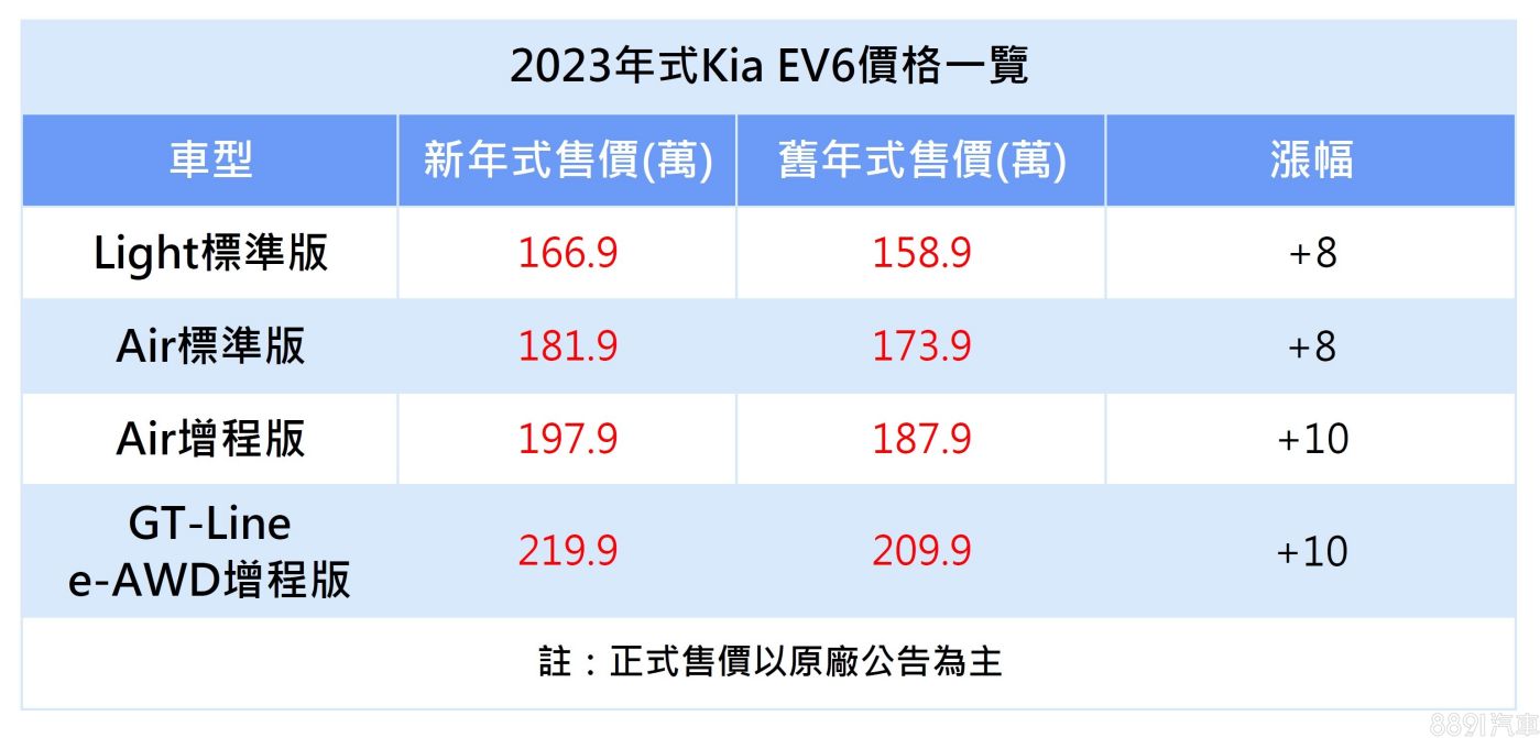 大漲價時代才正要開始?先前已傳出Kia將於2023年式調漲EV6售價,而近日經銷商端傳來消息,依車型漲幅落在8~10萬,據了解,新年式價格主要是反應國際原物料成本上漲以及匯率考量,配備上並沒有變動,確切價格預計稍晚才會由原廠公告。