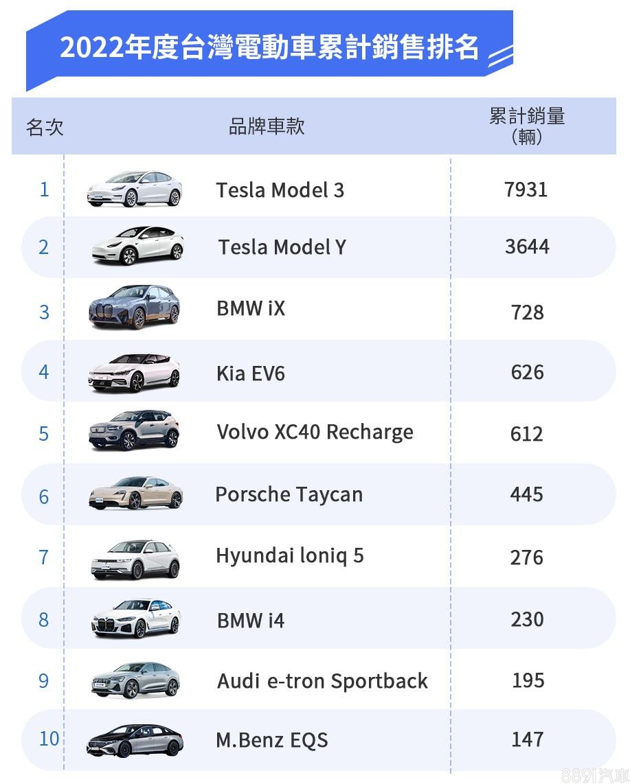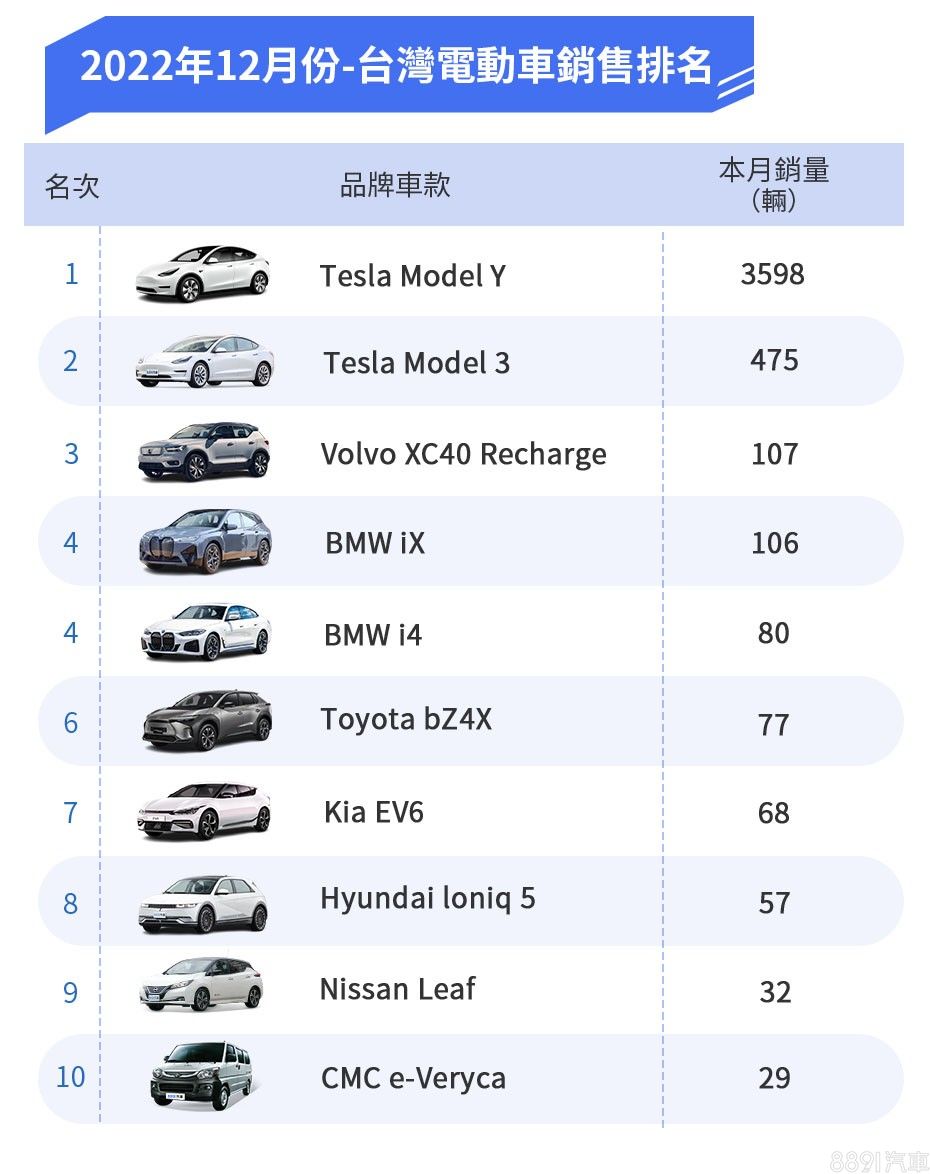值得一提的是,Model Y光2022年11、12月份的交車量,就足以使其衝上年度排行第二位,加上全球交付盛況,預計除了本身接單踴躍,海外原廠也會將生產資源全力投入,未來在台灣由Model Y取代Model 3、成為台灣電動車市場「主宰」應不難預想。