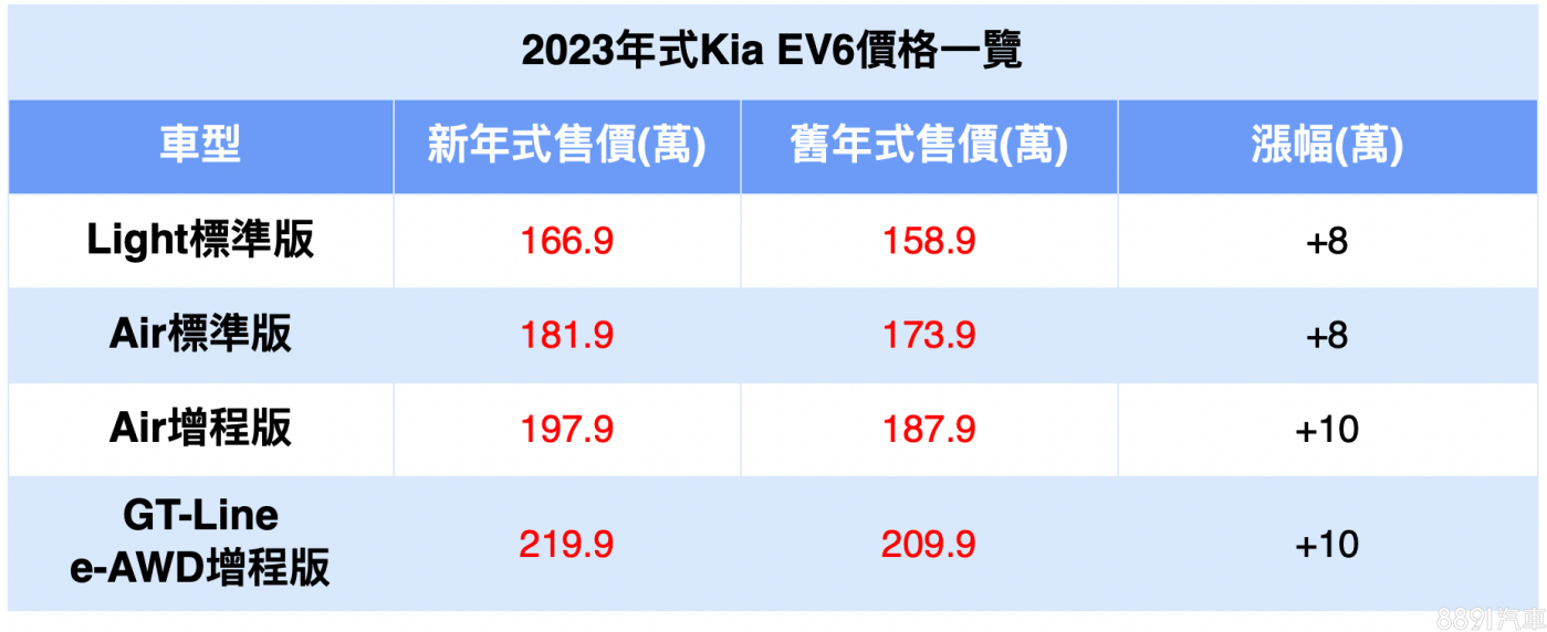 2023年式EV6依車型的不同,漲幅落在8~10萬,據了解,新年式價格上漲的原因,主要是反應國際原物料成本上漲以及匯率考量,配備上並沒有變動。
