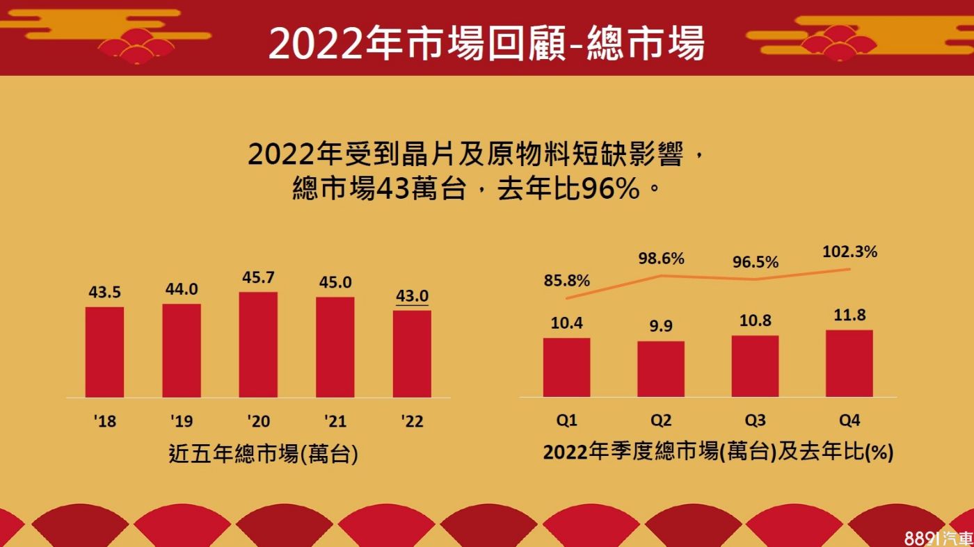 回顧2022年台灣車市,新車掛牌數43萬台,同比衰退了4%,主要是晶片及原物料短缺、供貨不穩定,缺車潮嚴重,和泰代理的三品牌(Toyota、Lexus、Hino)亦受到不小影響,合計登錄15萬台,較2021年短少6千台,但仍連續21年制霸台灣車市。