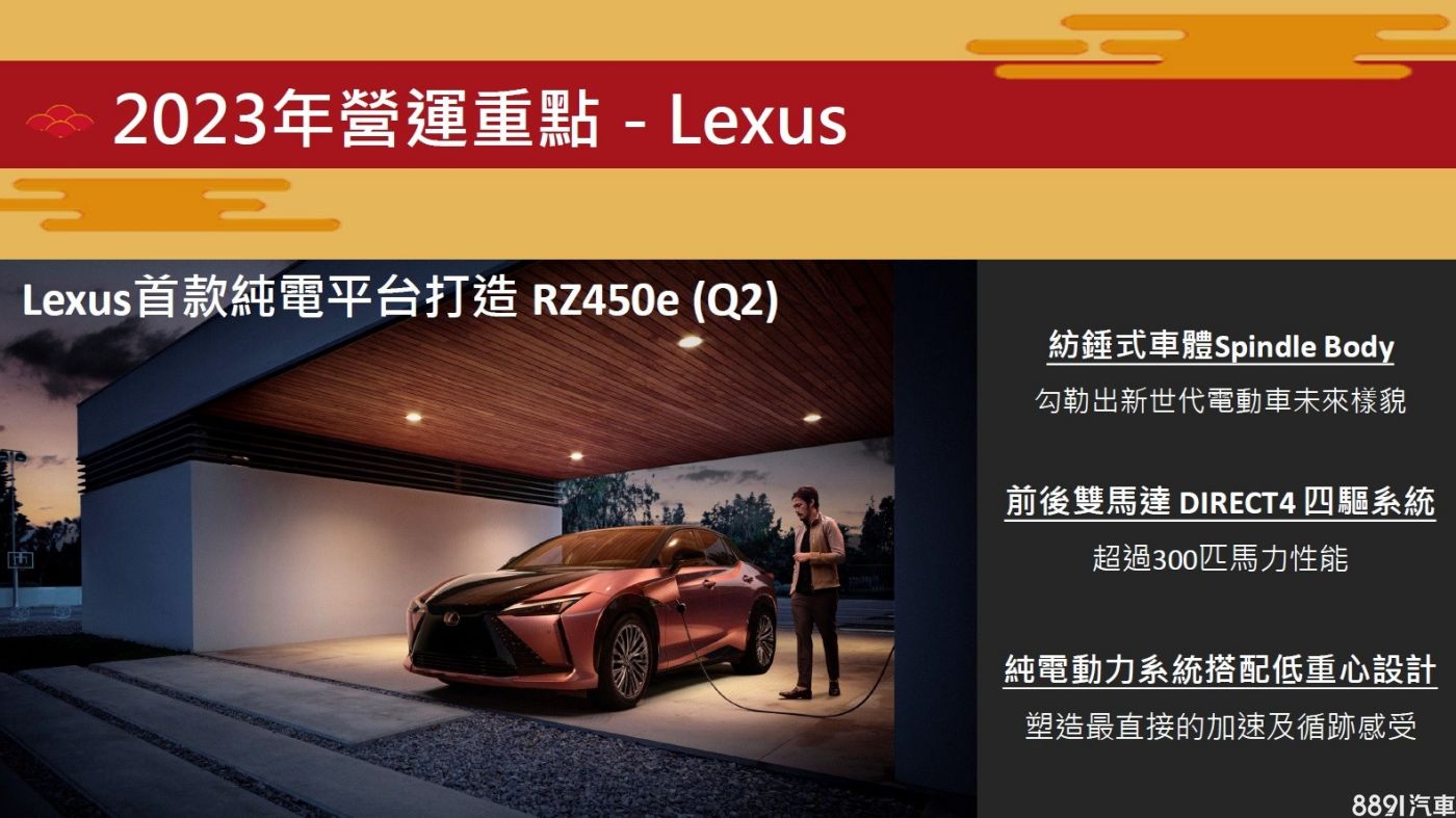 Lexus首款e-TNGA平台打造RZ 450e,其實也在去年和泰的爭取名單中,只不過受到「兄弟車」bZ4X召回的影響,上市排程也跟著後延,國內則規劃第二季上市。新車配置前後雙馬達+Direct4四驅系統,具備313hp/44.3kgm最大輸出,搭配71.4kWh的鋰電池組,能供應逾400km(WLTP)最大續航里程。