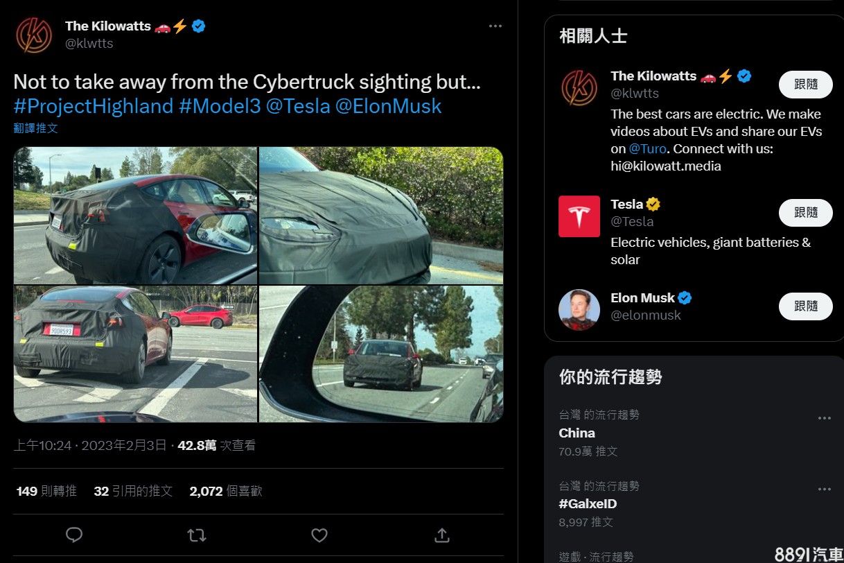 去年蟬聯台灣最暢銷電動車的特斯拉Model 3,問世至今也將近6年,原廠也在為小改款做準備。車系去年就遭爆料正進行廠內代號「Highland」的更新計畫,偽裝實車也在不久後被捕獲,而這次小改款更被目擊邁入道路測試階段。