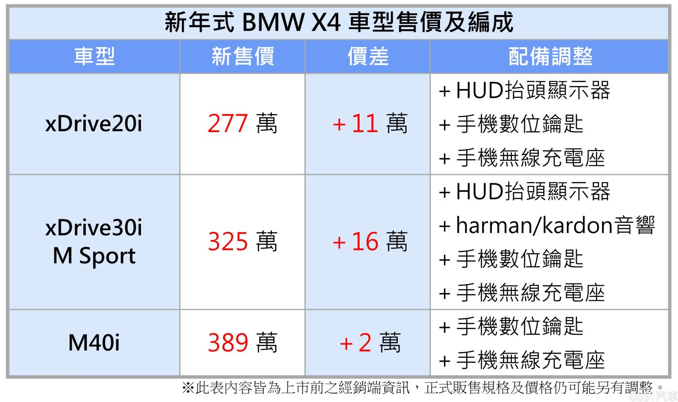 至於M40i調漲幅度最小,僅較舊年式小漲2萬元,配備上則追加手機數位鑰匙和無線充電座兩項目。根據消息來源,新規格與定價適用於今年1月以後生產之車型,不過新年式上市時程仍尚待後續公布。
