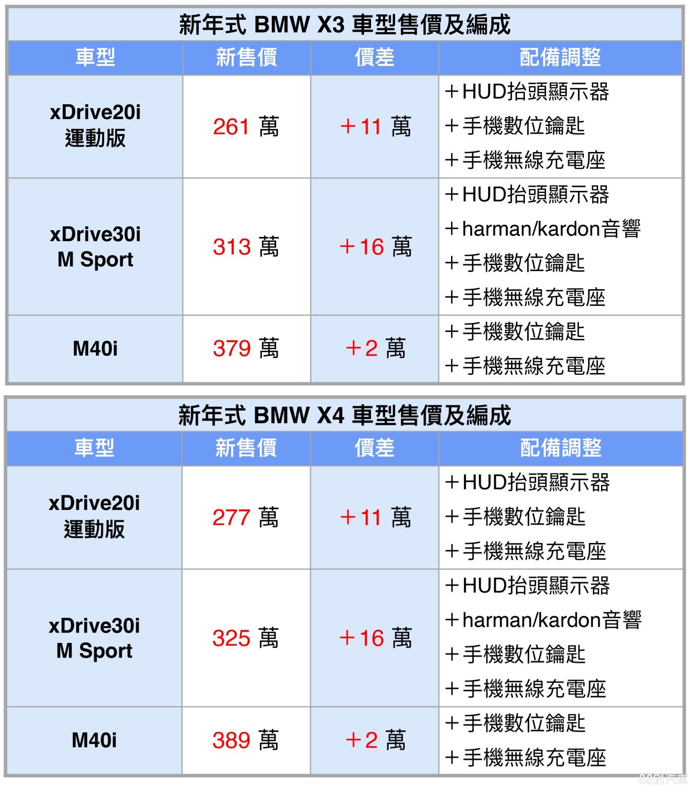 與先前經銷商流出的消息相同,雙車系新年式仍維持既有車系編成,不過價格也都有調漲,調幅2~16萬不等,但同時配備也更豐富,入門的xDrive20i漲價11萬,新增HUD抬頭顯示器、手機數位鑰匙和無線充電座,在舊年式如果想要選配這三樣配備,需要花費12萬。