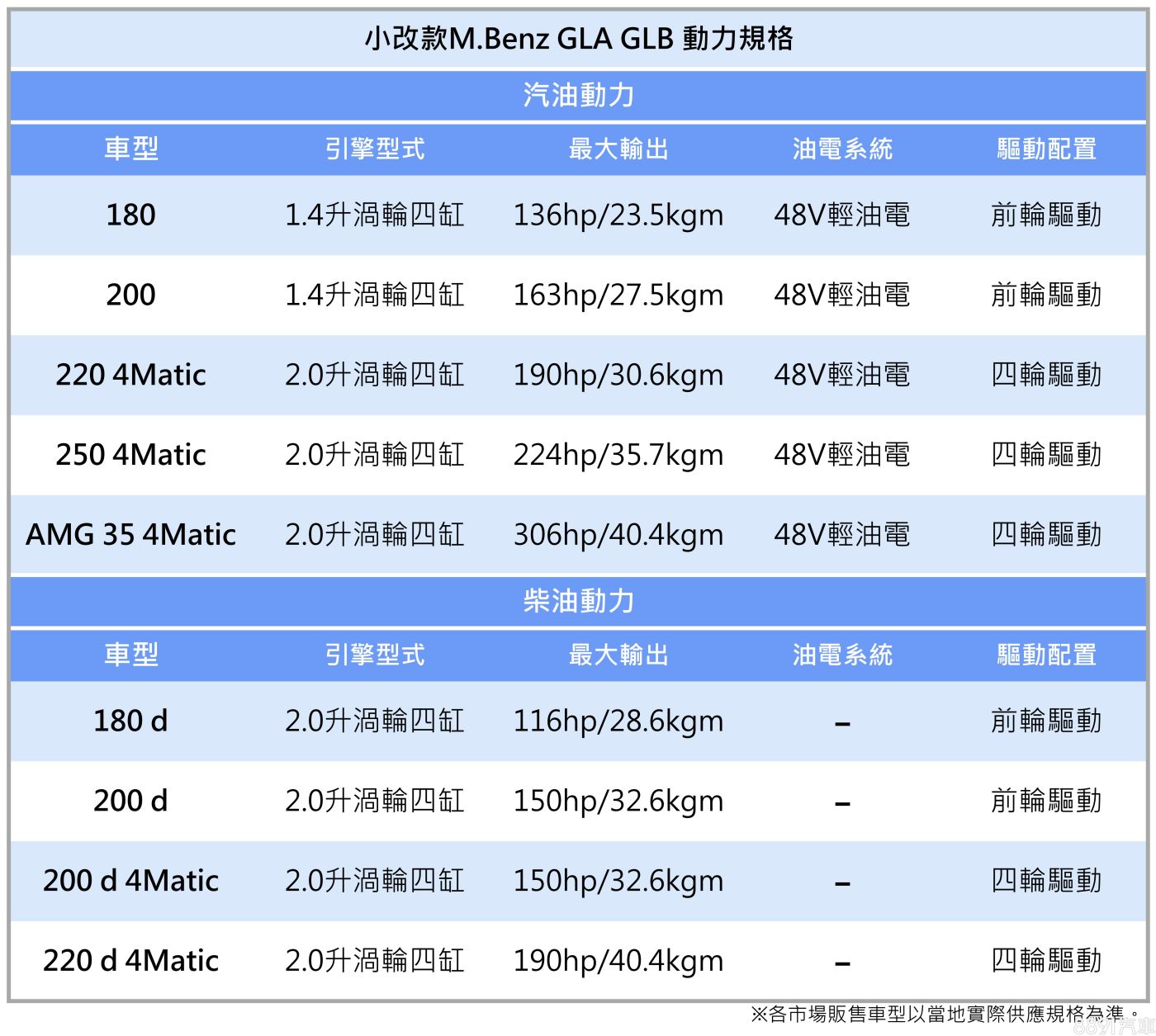 小改款GLA、GLB同樣提供1.4/2.0升汽油動力以及2.0升柴油動力,主要差異在於汽油引擎全面導入48V輕油電系統,可額外出力14hp,除了引擎啟動時震動輕微、噪音低之外,也支援引擎熄火滑行功能,進而減少碳排及油耗。