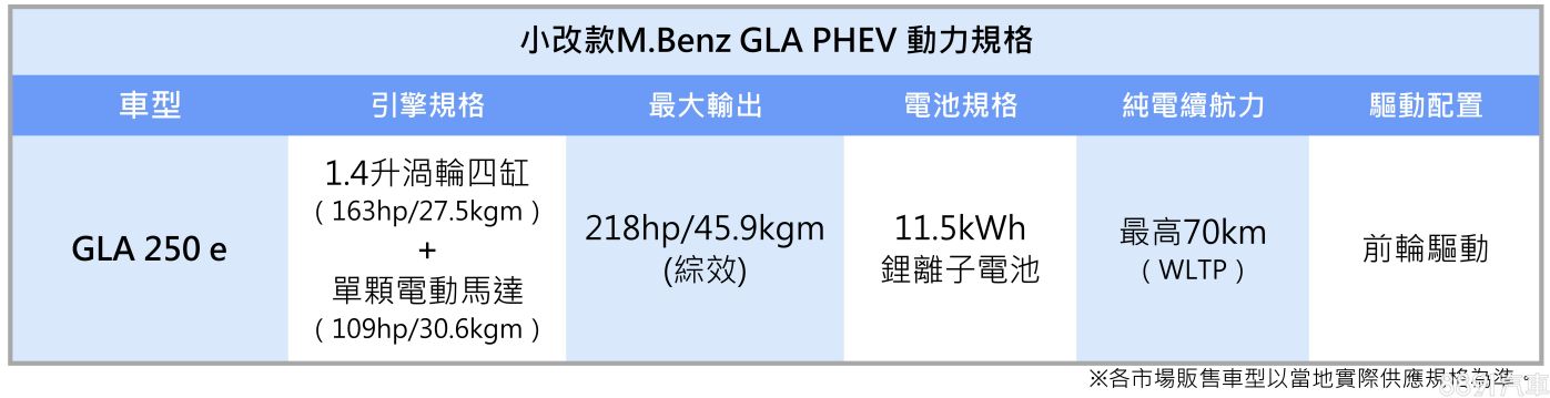 此外,GLA另有提供250e的PHEV車型,是以1.4升四缸渦輪引擎搭配電動馬達、11.5kWh電池組成,綜效輸出218hp/45.9kgm,擁有最高70km的純電續航力。