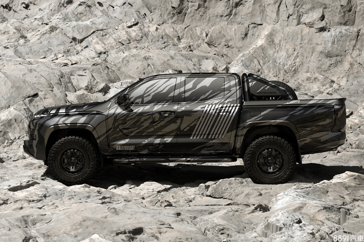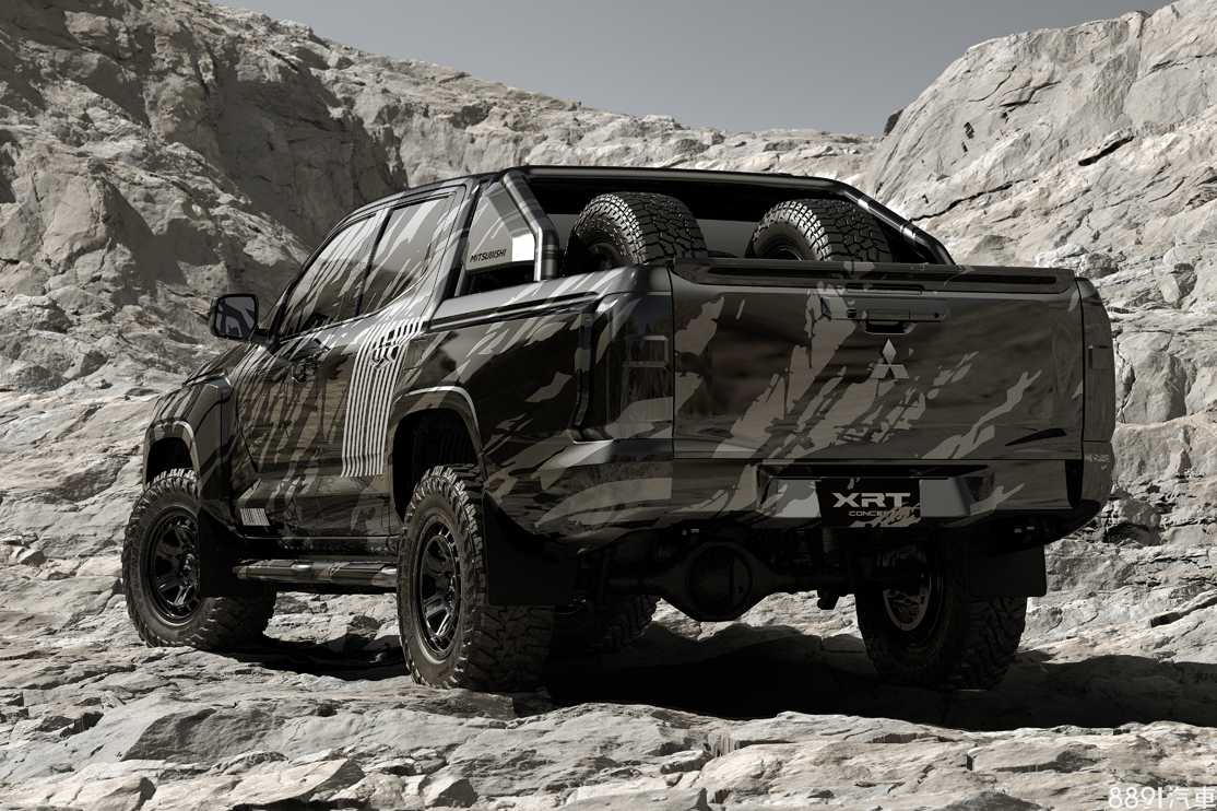 或許因為現行Triton拿下去年亞洲越野拉力賽冠軍頭銜,XRT概念車全車外觀以黑灰迷彩包覆,車側加入三菱性能子品牌「Ralliart」字樣和標誌性斜紋彩繪,加上涉水喉和貨斗上的防滾架及備胎,為XRT Concept散發出競技氛圍。