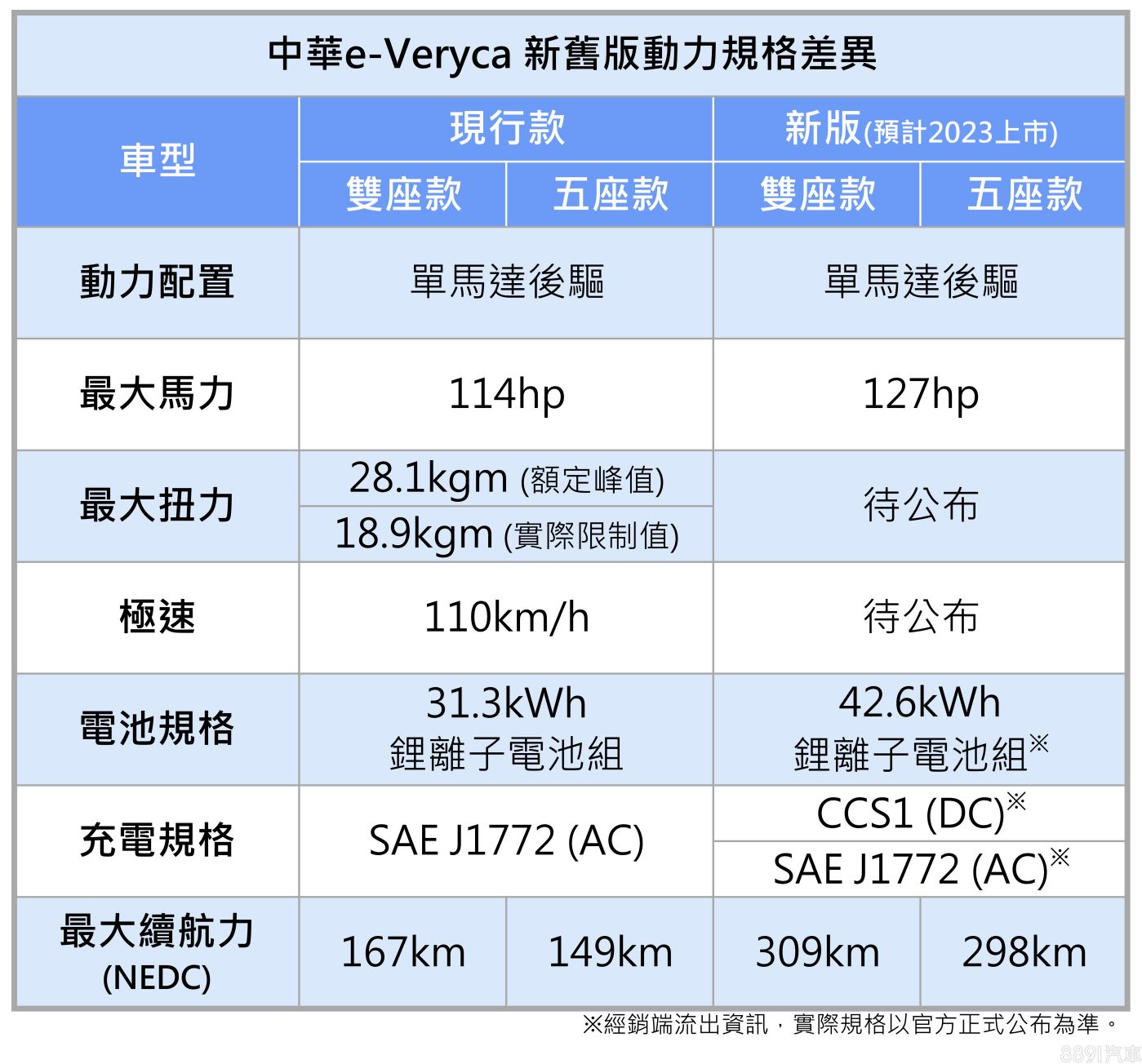 動力也預期跟進升級。其實原廠去年就曾送測新版e-Veryca,能源局資料揭露動力將小漲至127hp,較現行規格多13hp,且雙座款和五座款在NEDC標準下,最大續航力分別達309km和298km,比起現行款的167km、149km增幅顯著。