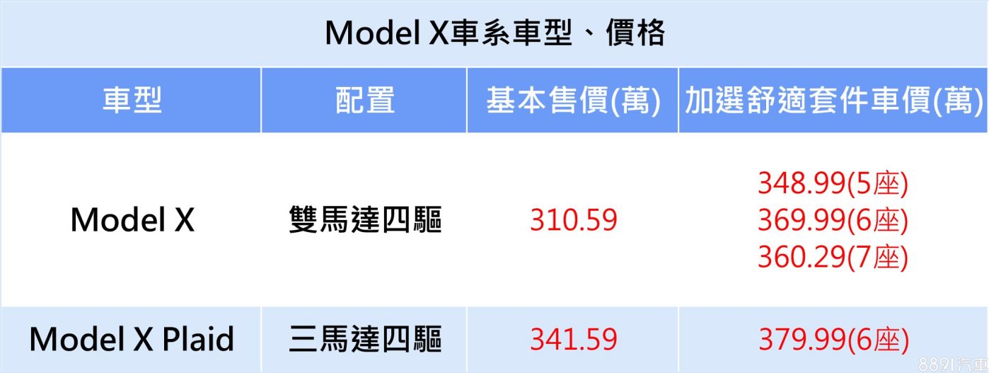 新款Model X車系有Model X、Model X Plaid兩種版本,基本售價分別為310.59、341.59萬元,同樣得選舒適套件,採雙馬達四驅的Model X,除了基本5座配置,還可選擇6座與7座款,而頂規Model X Plaid僅提供6座設定。
