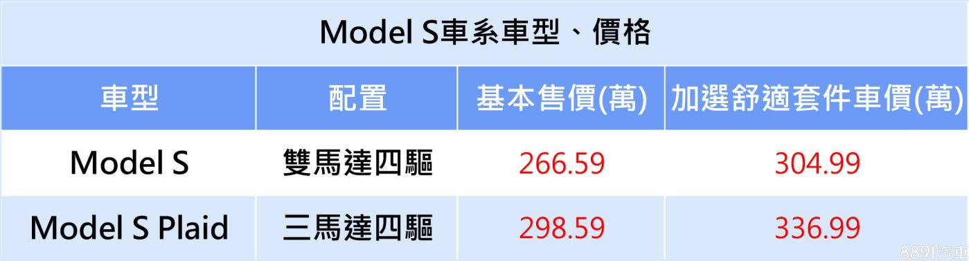新款Model S車系提供Model S、Model S Plaid雙車型可選,基本售價分別為266.59、298.59萬元,但得強制選配要價38.4萬、包含導航、電疊後視鏡、網路廣播、盲點預警與駕駛座記憶功能等的舒適套件。