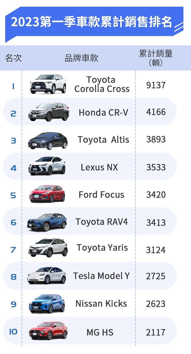 去年國內賣最好的前10名車款中,前三名都是Toyota,到了2023年第一季,Honda CR-V強勢擠入第二名,即便到了產品末期,還能有此番亮眼表現,實力確實堅強,順帶一提,第六代大改款CR-V國內預計下半年登場。至於今年第一季銷售冠軍則為Toyota Corolla Cross,一點也不令人意外。