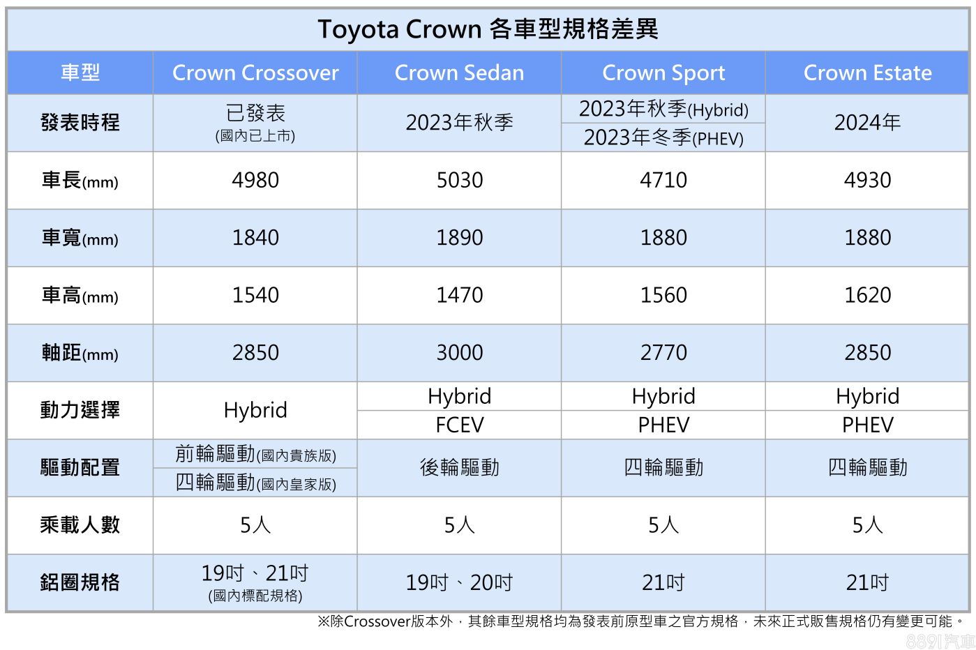 動力規格雖尚待公布,但從展示款車牌可見,現身的Crown Sedan為Hybrid油電車型。而根據官方預告資訊,Crown Sedan預計還會推出FCEV氫燃料版本,並同油電版皆採前置後驅設定,新車則預計於今年秋季正式發表。