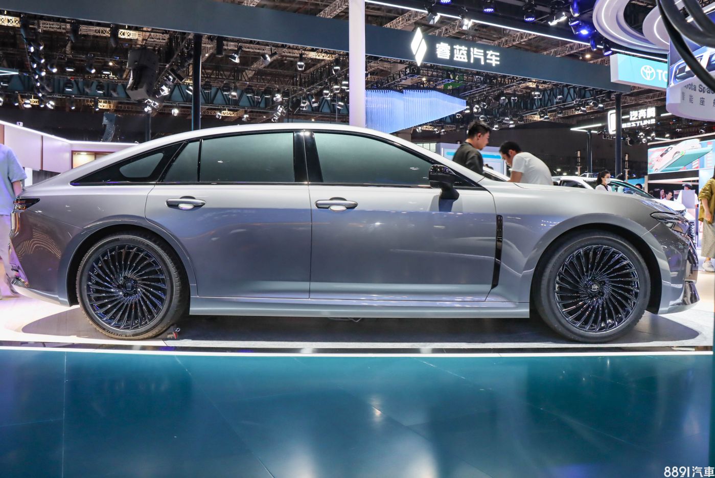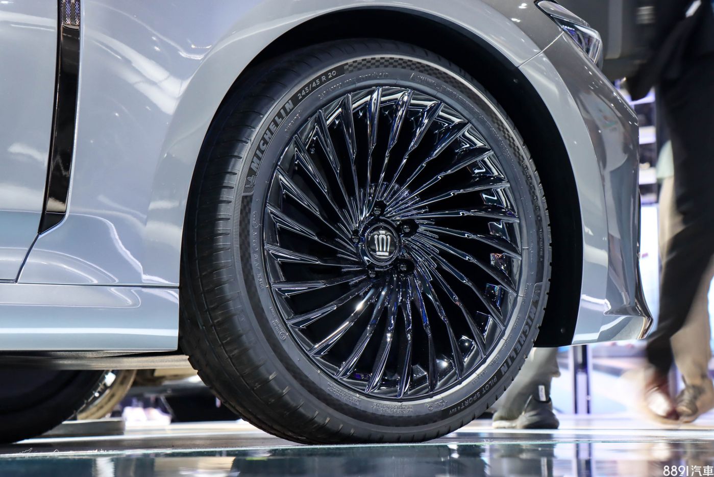 Crown Sedan展示車配備漩渦狀黑色20鋁圈,讓視覺焦點集中於中心蓋的皇冠Logo上,展示款雖採用245/45R20的米其林PS4 SUV休旅用胎,但預計未來販售車型應會換搭他款配胎。