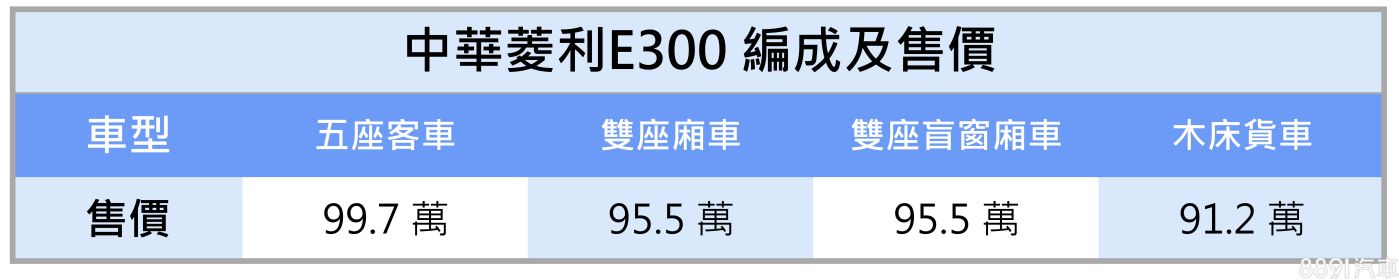 雖說是小改款,不過菱利E300內外設計未見明顯更動,就連新增的貨車版,造型上也和燃油版的Veryca A190別無二致。載運能力方面,雙座廂車可承載515kg,貨車版最大載重則可達603kg。