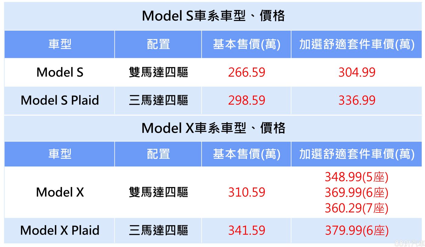 新款Model S和Model X定價雖然落在266.59~341.59萬之間,但兩車系各車型皆須強制加選38.4萬起的舒適套件,導致實際總價全都會突破300萬門檻。其中除了Model S Plaid抵台時程未定外,其餘車型都會自本季起陸續開始交車。