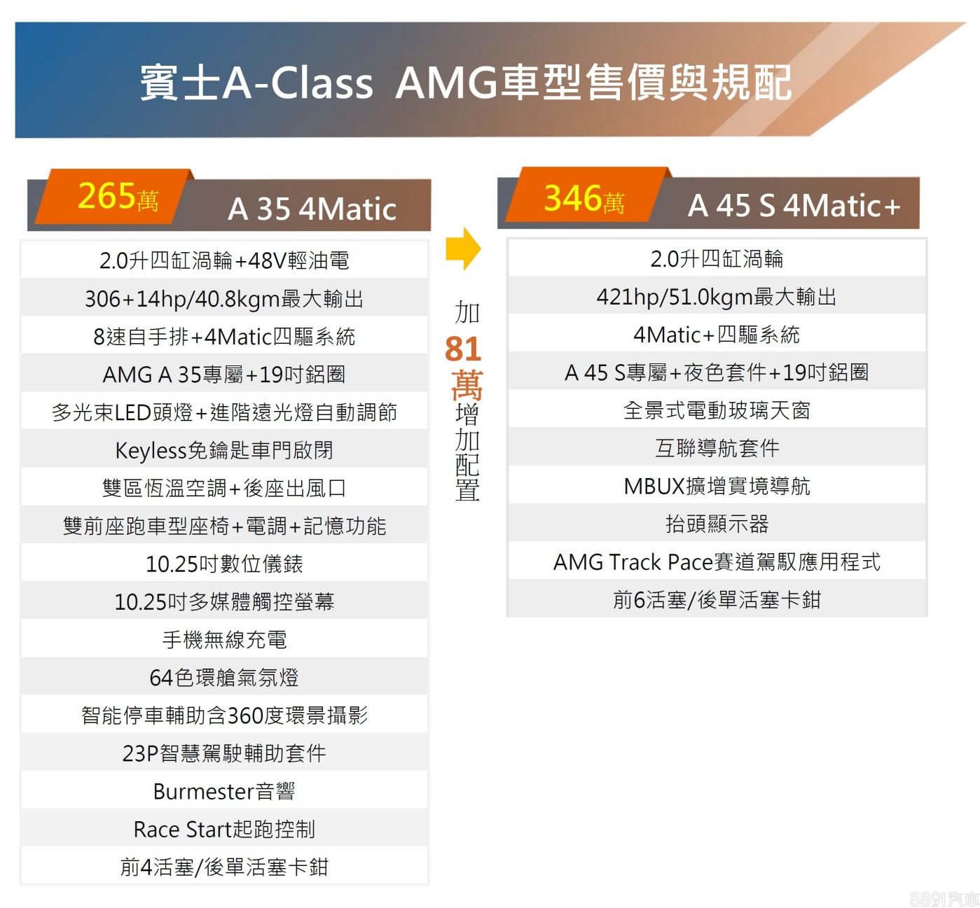 兩車型除了專屬AMG內外套件,比起一般版本還添加多光束智慧LED頭燈、雙區恆溫空調、Burmester音響、360度環景等配備,頂規的45 S再追加夜色套件、互聯導航套件、MBUX擴增實境導航、抬頭顯示器和電動天窗等。