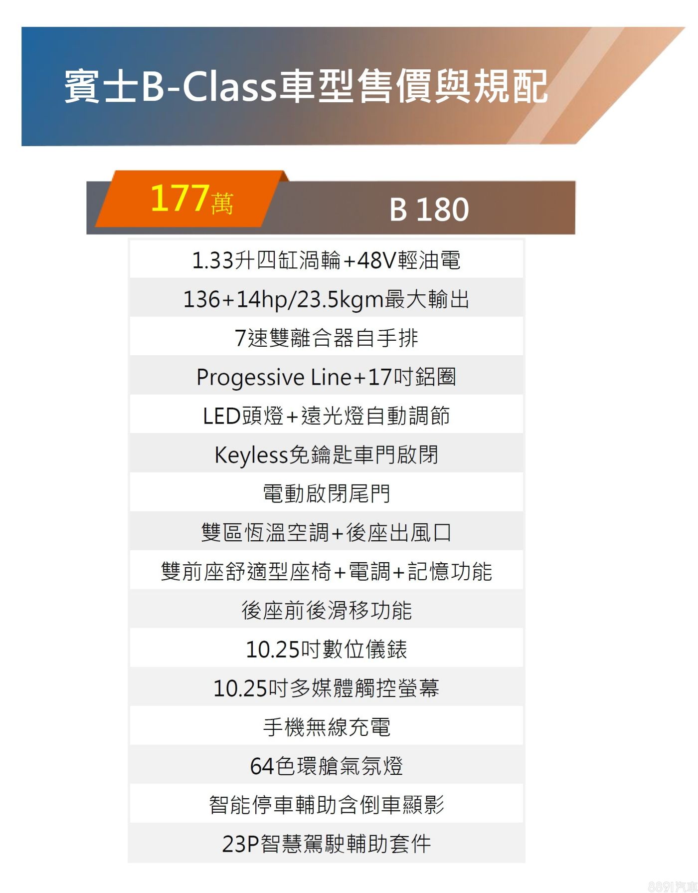 捨棄原先多動力的編成,小改款A-Class及B-Class國內僅供單一動力設定,並全面導入48V輕油電科技,售價方面,A 180五門掀背、A 180四門房車以及B 180依序為181萬、183萬及177萬起。