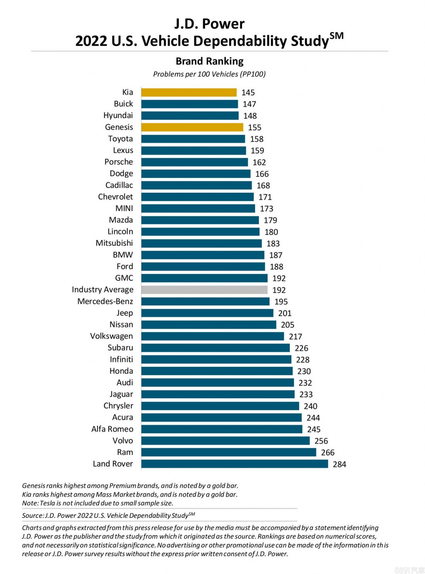 可靠度好壞,數字說話才準!J.D. Power為美國最具公信力的第三方調查報告,每年皆會公布汽車品牌可靠度排行,調查基準為持有3年內,品牌每100台車所會遇到的問題數量,數字越小排名越高,於2022年度評比,韓系車廠Kia、Hyundai、Genesis分別拿下1、3、4名,佔據一般乘用車、高級車可靠度冠軍寶座。