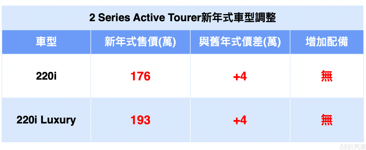 同時,BMW汎德官網也上架了新年式2 Series Active Tourer,陣容維持220i與220i Luxury,售價分別為176萬、193萬,雙雙較舊年式調漲4萬,配備部份則沒有變動。