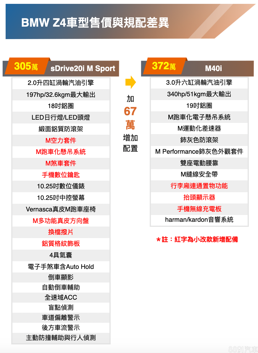 小改款Z4維持雙車型編成,兩種版本動力輸出都維持不變,而入門的sDrive20i動力,車名從過去的sDrive20i Sport Line,更新為sDrive20i M Sport,售價則從過去的281萬調漲24萬來到305萬,頂規的M40i則維持372萬,並未調漲。