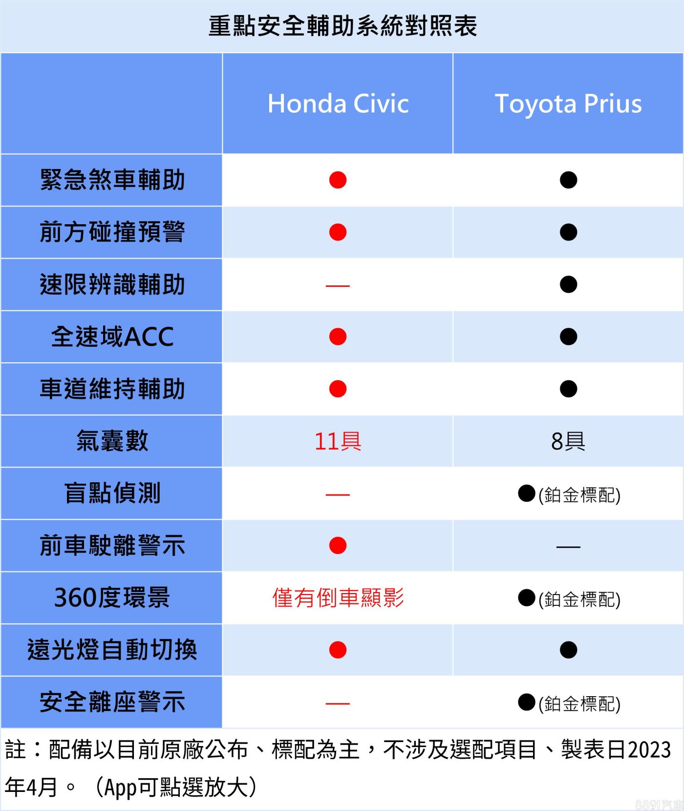 主被動安全輔助項目方面,雙方不相上下,重點符合Level 2自動駕駛標準的科技當然少不了,而Prius需至頂規,才能擁有較豐富的配置。
