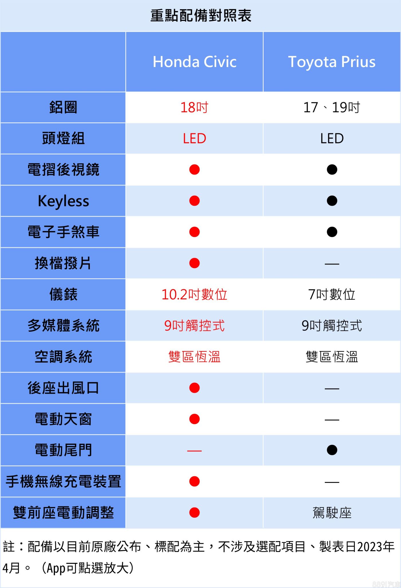 配備方面就是Civic占上風,小缺憾僅少了電動尾門,其他堪稱應有盡有,Prius雖也算完善,但明顯少了些便利配置。