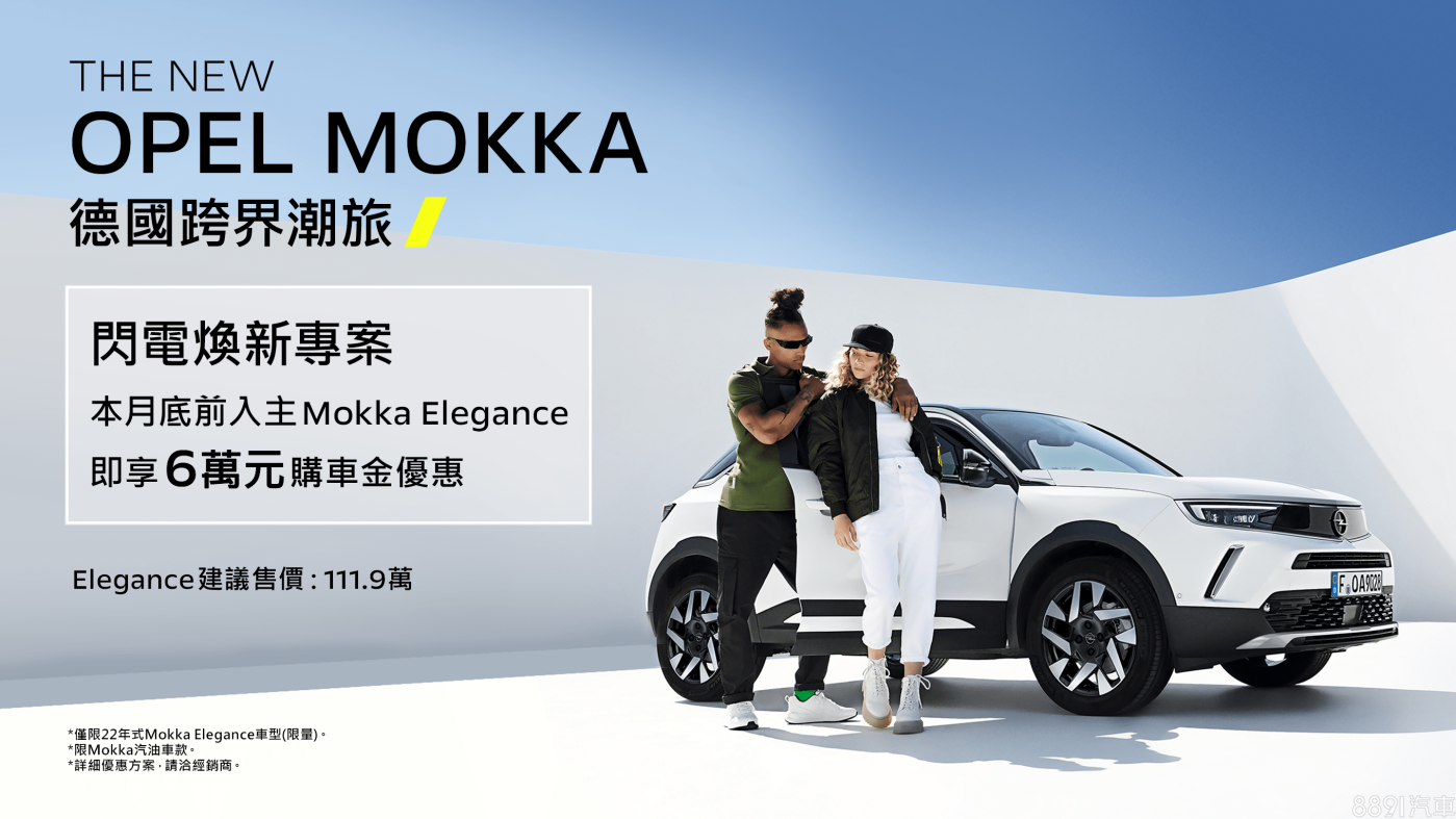 CUV車型Mokka也推出本月優惠方案,Mokka Elegance本月入主可享6萬元購車金(限22年式),Mokka-e Elegance 本月入主即可享有3+1年不限里程延長保固優惠(不限年式)。