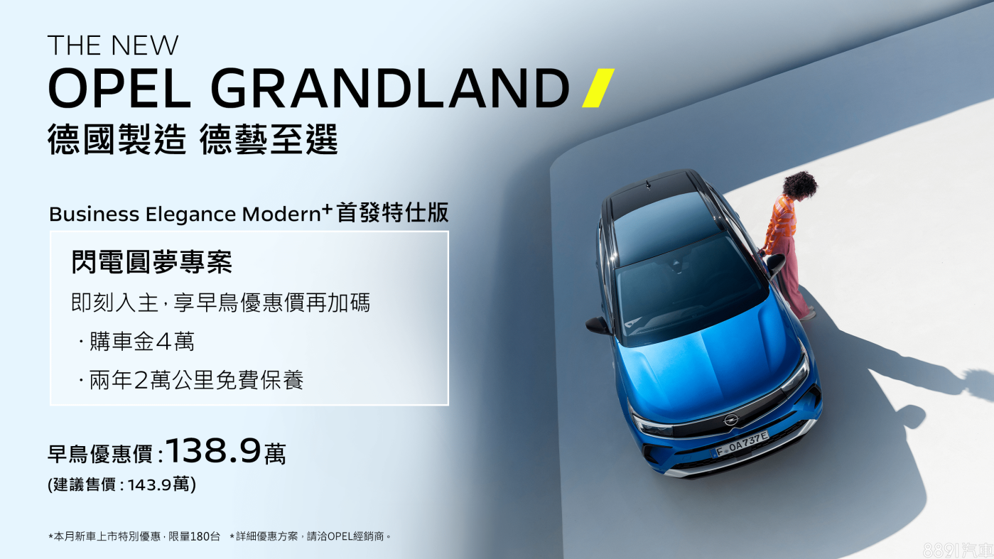 Opel Grandland的早鳥優惠則是持續進行中:GS Line(折2萬、限量40台)127.9萬元 、Business Elegance Modern(折3萬、接單生產)134.9萬元以及Business Elegance Modern+首發特仕版(折5萬、限量180台)138.9萬元,指定車型最高享4萬元購車金及2年2萬公里免費保養。