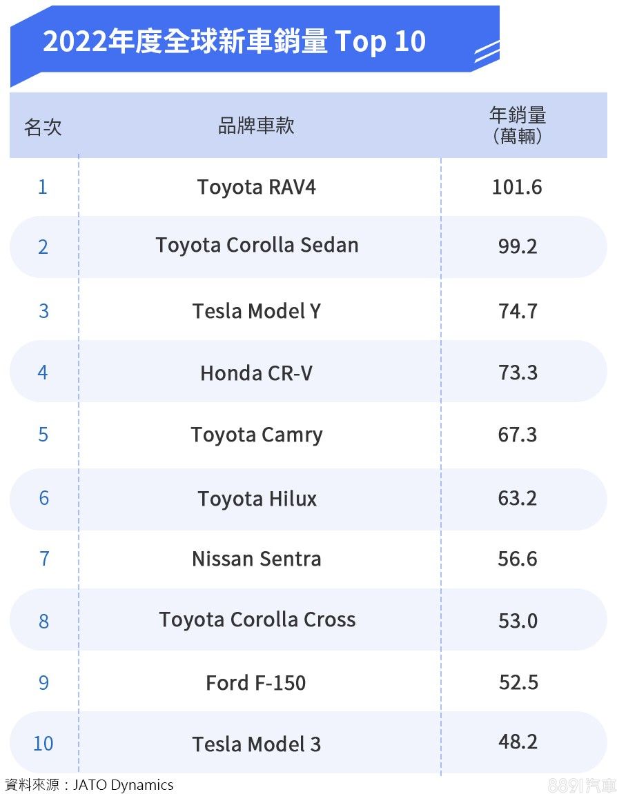 同樣入榜的豐田車款,還包含Corolla房車、Camry、Hilux和Corolla Cross,共五款產品擠進Top10,讓豐田堪稱去年度新車市場最大贏家,平均每賣8輛車就有一款「牛頭牌」,也幫豐田繼續蟬聯全球最暢銷車廠。