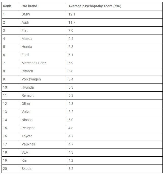 Scrap Car Comparison表示,這項測驗的駕駛平均成績為6.6分,而居冠的BMW駕駛們拿下平均12.1的高分,代表他們可能失控的機率是一般人的2倍。最後一名則是Skoda,心理測驗結果表示,Skoda駕駛多數有著冷靜的特質,不容易衝動行事。