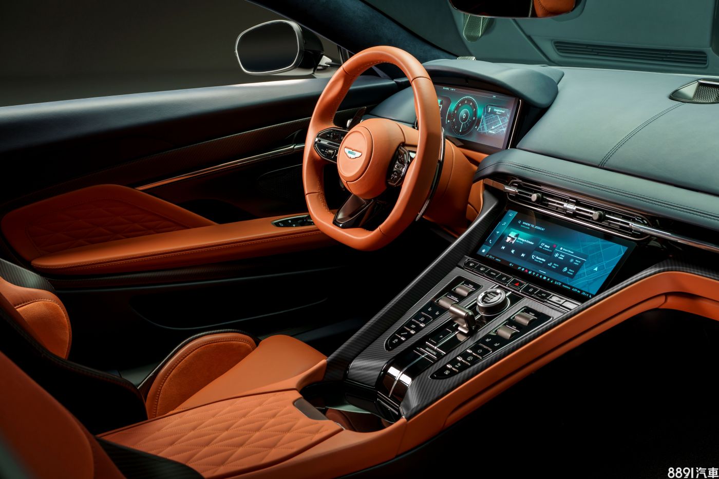 車室維持2+2座布局,座椅和內裝飾板採人造麂皮與真皮混拼包覆,搭配菱格紋設計提升質感,原廠另提供全真皮座椅可選。國內DB12標配11支揚聲器的原廠音響,但可加價升級15支揚聲器的Bowers & Wilkins環繞音響系統。