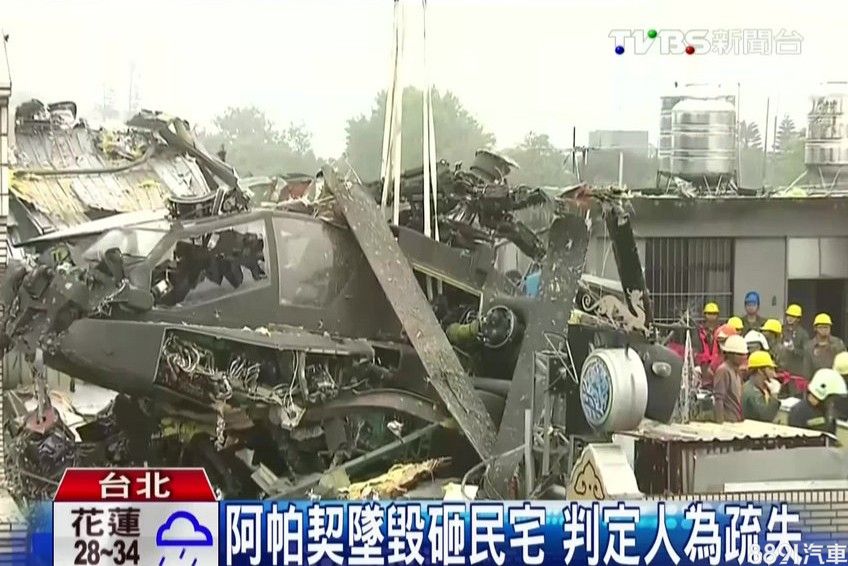 國軍阿帕契直升機曾於2014年4月執行例行飛行訓練時,不慎撞上並墜落於桃園龍潭民宅頂樓,所幸無人死亡,最後證實是人為疏失,不過確實、誰想的到真的會發生「人在家中坐、禍從天上來」這種事(圖取自TVBS新聞)。