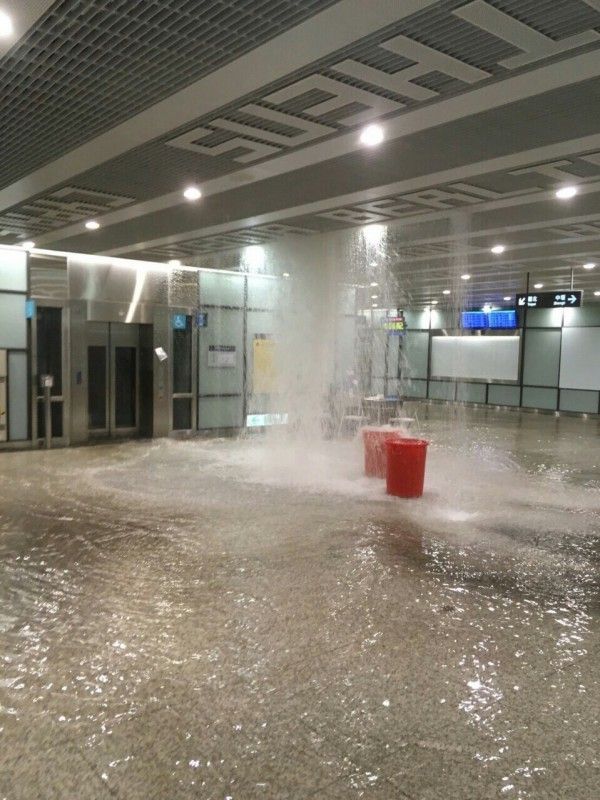 桃園國際機場第二航廈捷運A13站,在2016年6月因午後豪雨加上水管破裂,從天花板傾瀉、宛如瀑布的超大雨水量,連水桶都接不住,也因此被部分網友戲稱是「全國最大室內人工瀑布」,光看圖確實有點荒謬(圖取自爆料公社)。