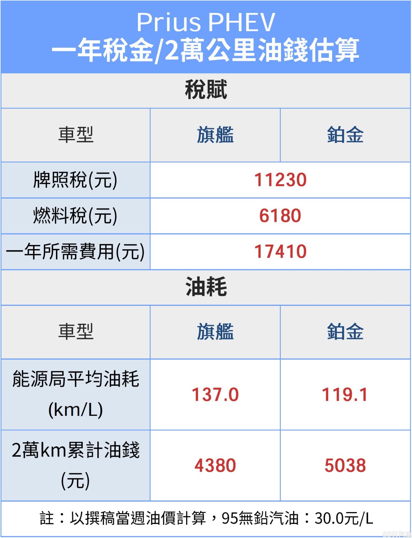 比起前代在1800c.c.以內的級距,Prius PHEV的2.0升動力每年要多繳5490元,在油耗部分,由於插電式油電架構的關係,能源局數據每公升破百km,聽起來是很美好,實際狀況還是要看充電的可行性有多少,如果每天回家可以插著充電直到早上出門,一天通勤距離在純電里程的Cover範圍內(旗艦:97km、柏金:87km),累計油錢或許還低於上述表格的費用,真的省!