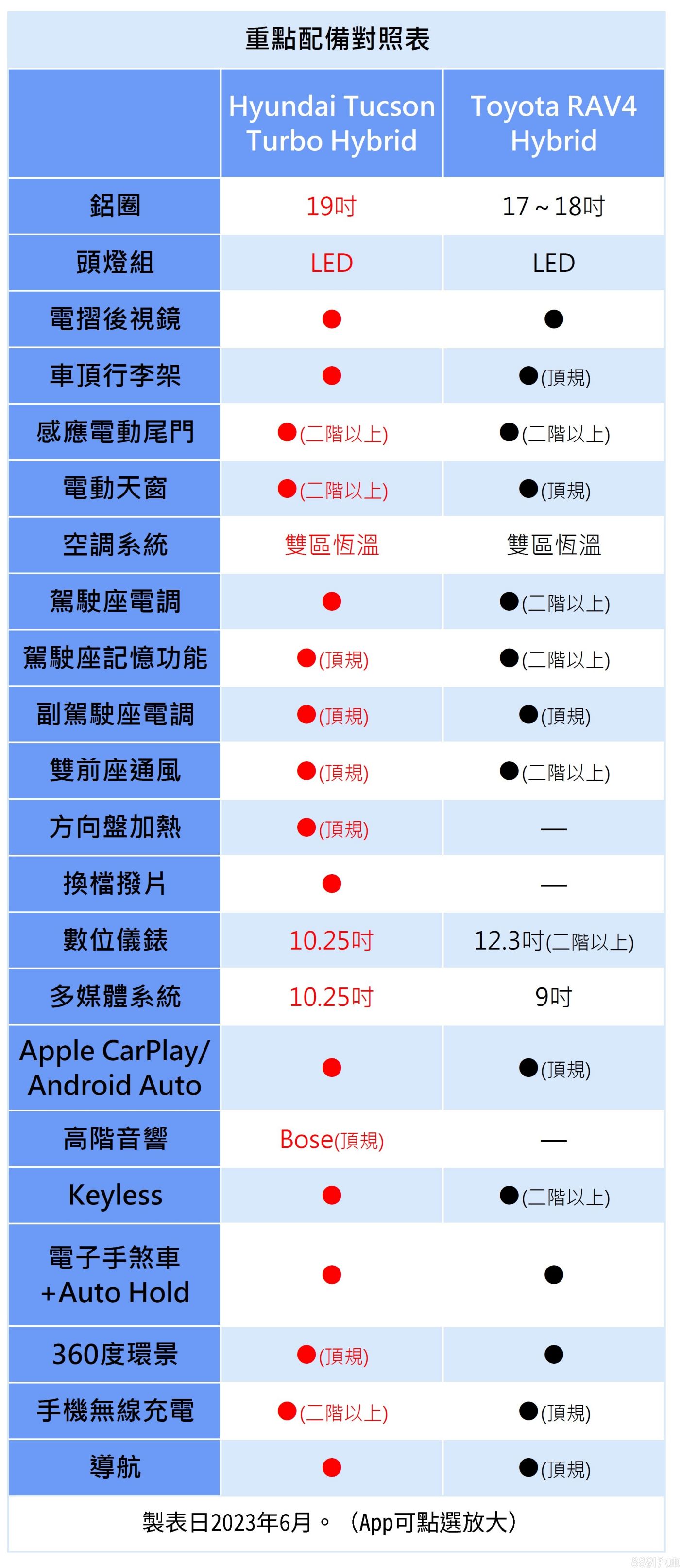 攤開規格表來看,兩車訂價策略相仿,入門車型就是賣油電動力,想要多一點配備,就得望向中階以上車型。Tucson全系標配19吋鋁圈,視覺上更有氣勢,中階就享有電動天窗、電動尾門,而頂規更是齊全,還多了高階音響、方向盤加熱等,舒適度上有加分;相比之下RAV4多數配備都是頂規獨享,就連基礎的導航、手機連線也是,配備豐富度確實不如對手。