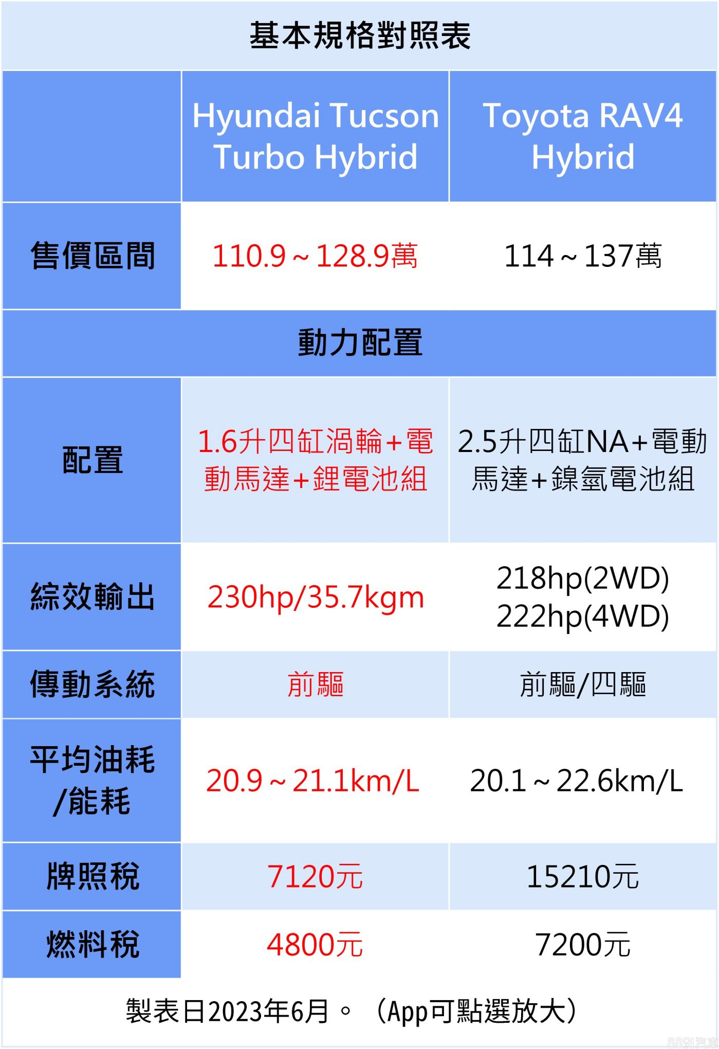 挾著國產的優勢,Tucson油電的售價訂得比RAV4油電更親民,兩者都規劃3車型,入門相差3.1萬、頂規相差8.1萬,價差不算大,但對於預算型買家而言,勢必也會列入考量;動力雖然都是油電,但配置差異頗大,Tucson以1.6升渦輪構成Hybrid系統,相比對手的2.5升NA引擎,綜效輸出小贏一些、每年稅金也更省,油耗數據算是伯仲之間,至於RAV4比較明顯的優勢,就是有提供4WD車型,讓有輕度越野需求的玩家可做選擇。