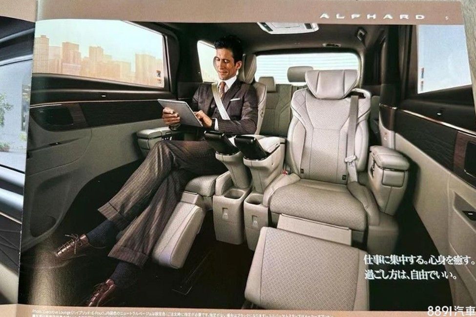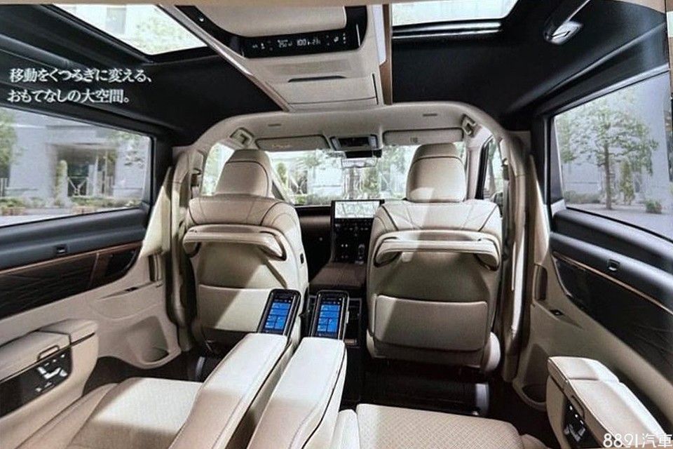 日規新Alphard清一色採「2-2-3」的7座設定,第二排為獨立雙座,照片中的椅面設計與先行發表的Lexus LM相似,並配備大改款導入的「後座管家」功能,推測能比照LM,可藉內側扶手前端的專屬平板,遙控車室照明、音響、空調和座椅等操作。