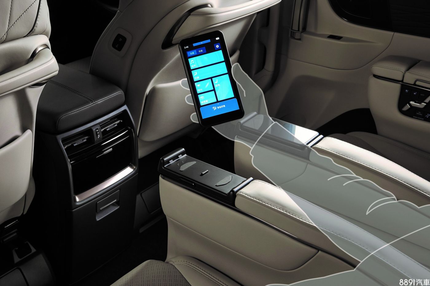 第二排座椅內側扶手配備無線控制面板,可遙控調整燈光、座椅、空調、音響、遮陽簾等,使用上很方便、也很有尊榮感。