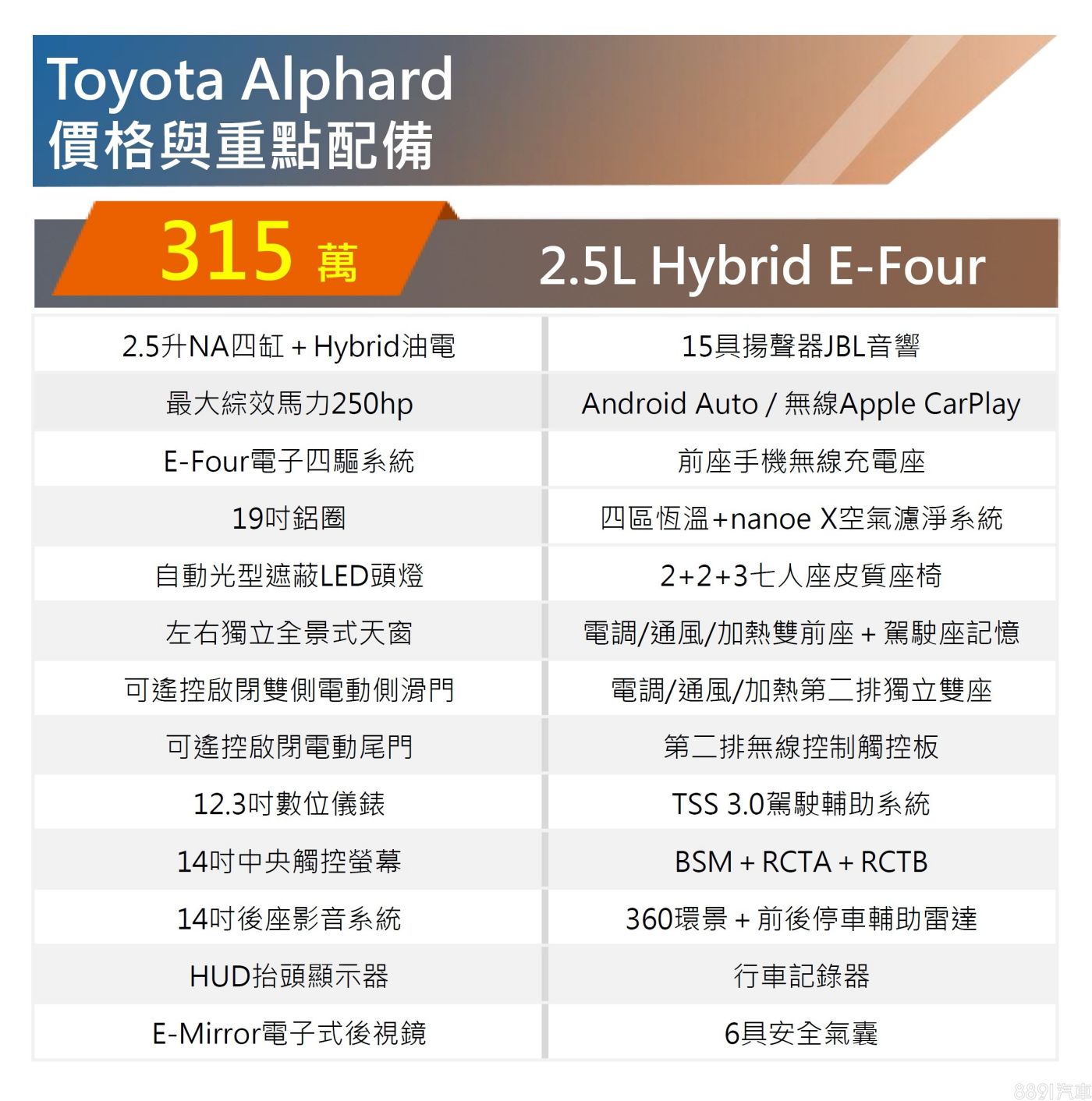 頗受大老闆喜愛的Toyota Alphard大改款抵台,國內規劃單一油電動力車型,開價315萬,外觀提供貴族黑、星河鈦、珍珠白、星燦銅四種車色可挑,內裝則有黑色與米色兩種選項,不過和泰表示新車今年配額僅500台,並且已全數完售。