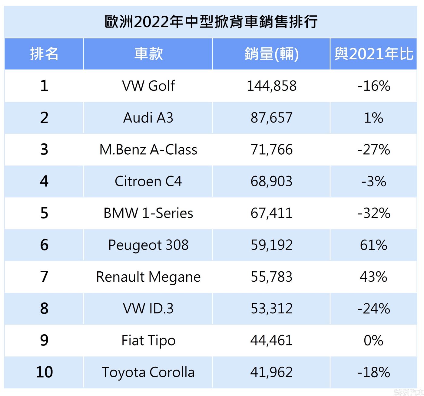根據調研機構「Car Industry Analysis」整理數據,2022年歐洲中型掀背車銷售排行,從品牌來看,德國車仍是最大贏家,包含福斯、奧迪、賓士、BMW在內共有6款車上榜,一舉囊括了前3名,而法國車也有Peugeot、Renault各一款車做代表,至於國內較為熟悉、且賣不錯的Ford Focus並未入列,原因是因為銷量衰退2成,導致名次從前年的第7名一路滑至第11名,算是榜單上的遺珠之憾!