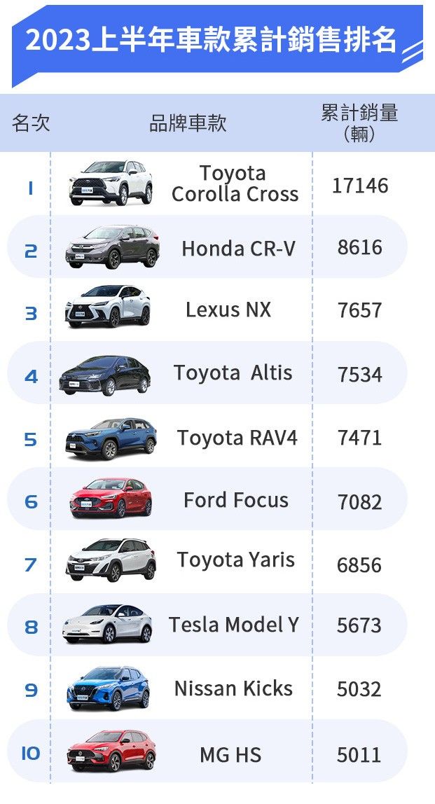 擠進前10名的車款和第一季結束時相同,僅稍微有些名次上的變動,首位仍由Toyota Corolla Cross穩坐,值得一提的是,Lexus NX擠下Toyota Altis成為第三名,創下NX新紀錄,也是首次豪華品牌車款擠進市場前三的位置。