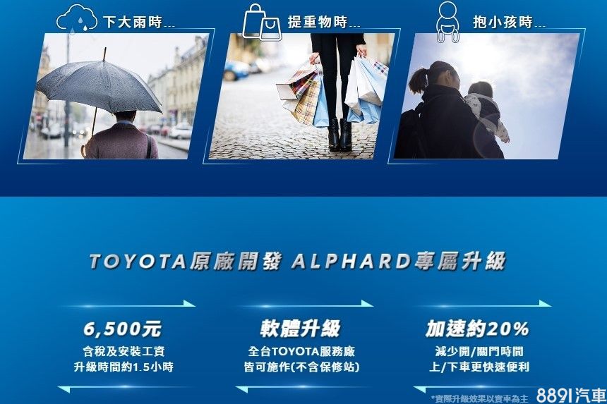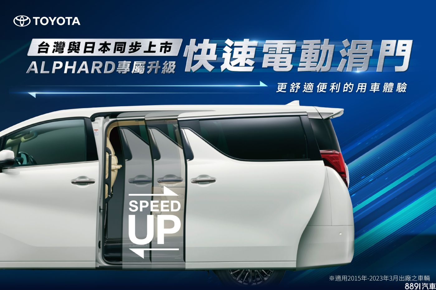 繼2022年推出RAV4 TSS升級方案後,和泰再向Toyota原廠爭取其他升級品項,並於今(7/12)日宣布推出舊款Alphard快速電動滑門升級專案,適用於2015~2023年3月間出廠之車輛,升級費用為新台幣6500元(含稅+工資),即日起開放預約,預計8/1起可回服務廠進行更新。