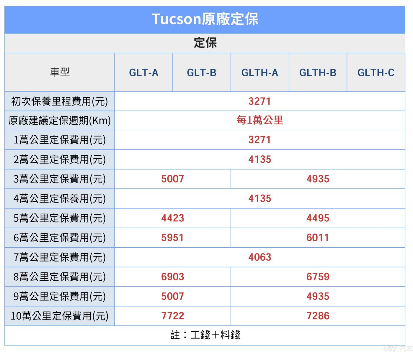 Tucson提供2種動力、並劃分成5個車型,不過根據原廠提供的資料,保養成本上僅針對不同動力做區隔,前2萬公里定保費用相當,自3萬公里後出現分歧,原以為科技更勝一籌的油電版,在定保費用上會比汽油版貴,但其實細看下來,費用差異並不大,以10萬公里累積下來的花費來看,油電版甚至還便宜了592元。