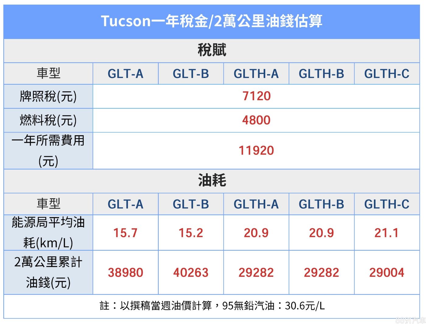 Tucson兩版本皆搭載1.6升渦輪引擎,擁有小排量稅金優勢,每年牌照+燃料稅僅1萬元出頭,負擔不大!不過油電版多了電動馬達、鋰電池組相助,最大馬力多了50hp,更能跑之外,能源局油耗數字也突破「2字頭」,若是頻繁用車的消費者,省不省高下立判!