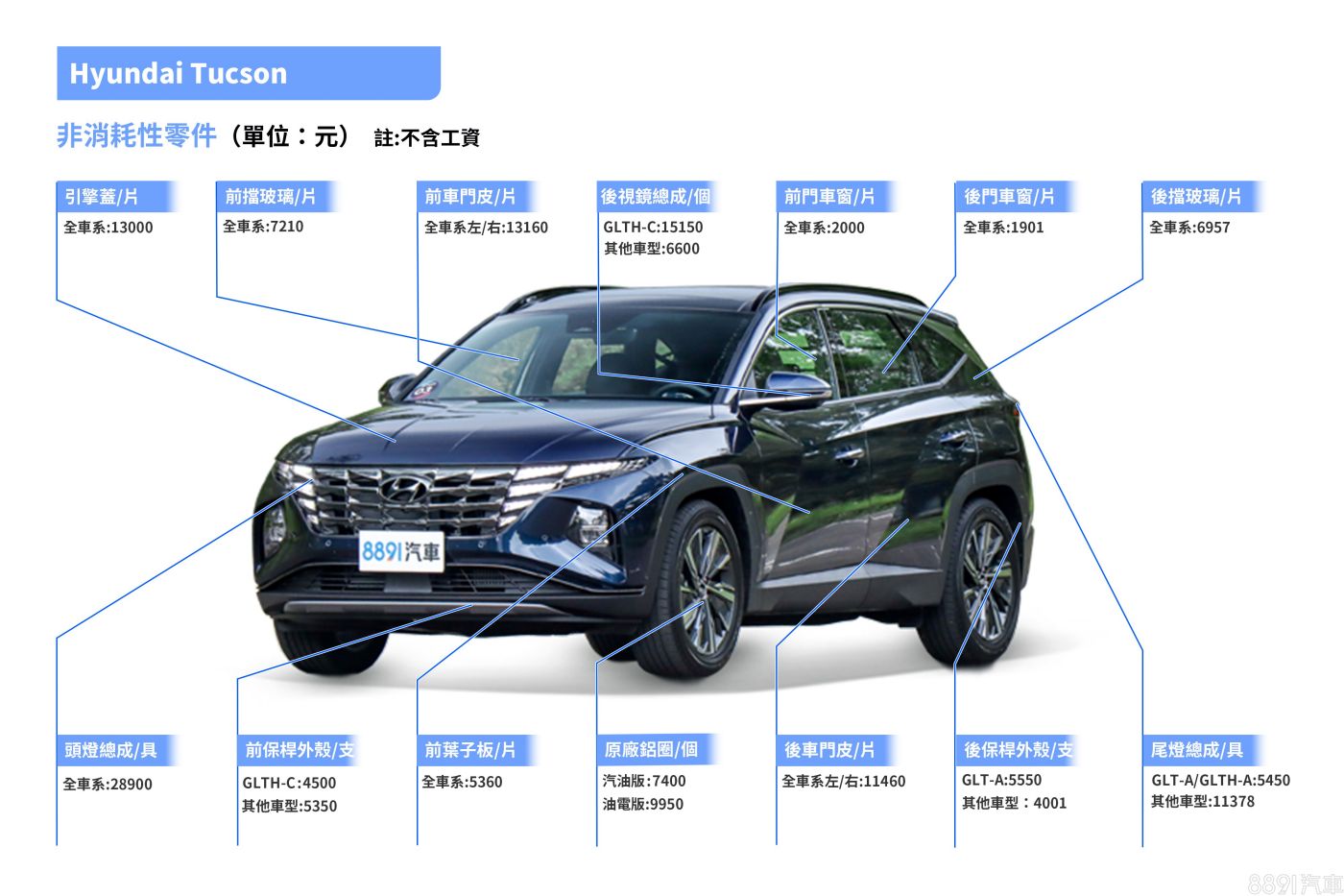 Tucson消耗性零件價格平實,沒有太過誇張的報價,多數品項費用相仿,僅有變速箱油有明顯差異,這主要跟變速箱配置有關,汽油版搭載7速DCT自手排,而油電版採用傳統6速手自排,油品報價不同,兩動力皆腳踩瑪吉斯Bravo HP-M3輪胎,不過汽油版是18吋、油電版是19吋,原廠報價1條只差200元,未來換胎成本也不會差異太多。
